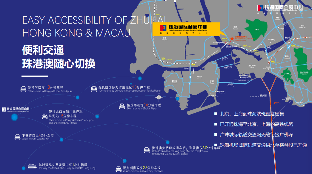 会场简介:珠海国际会展中心地处珠海十字门中央商务区核心位置,是目前珠海市规模最大、配套齐全、设施先进的高端会展综合体。珠海国际会展中心区位得天独厚,紧邻拱北、横琴、湾仔三大口岸,车程仅需5-15分钟。与澳门特别行政区隔海相望,直线距离约1.5公里,持有效往来港澳通行证及有效签注,即可便捷通关往返澳门。同时,会展中心邻近港珠澳大桥珠海公路口岸,经大桥前往香港,约1.5-2小时可达香港市区。